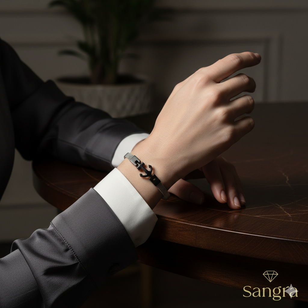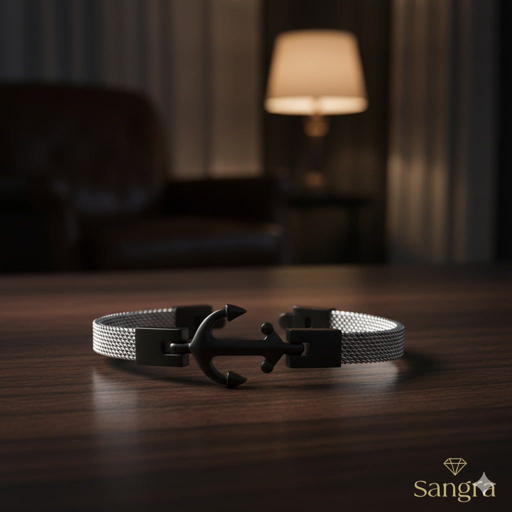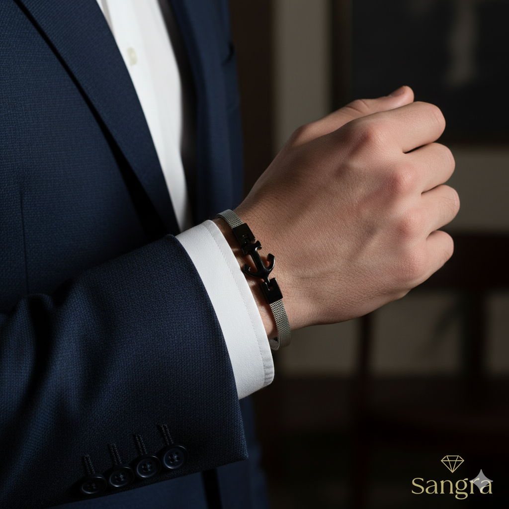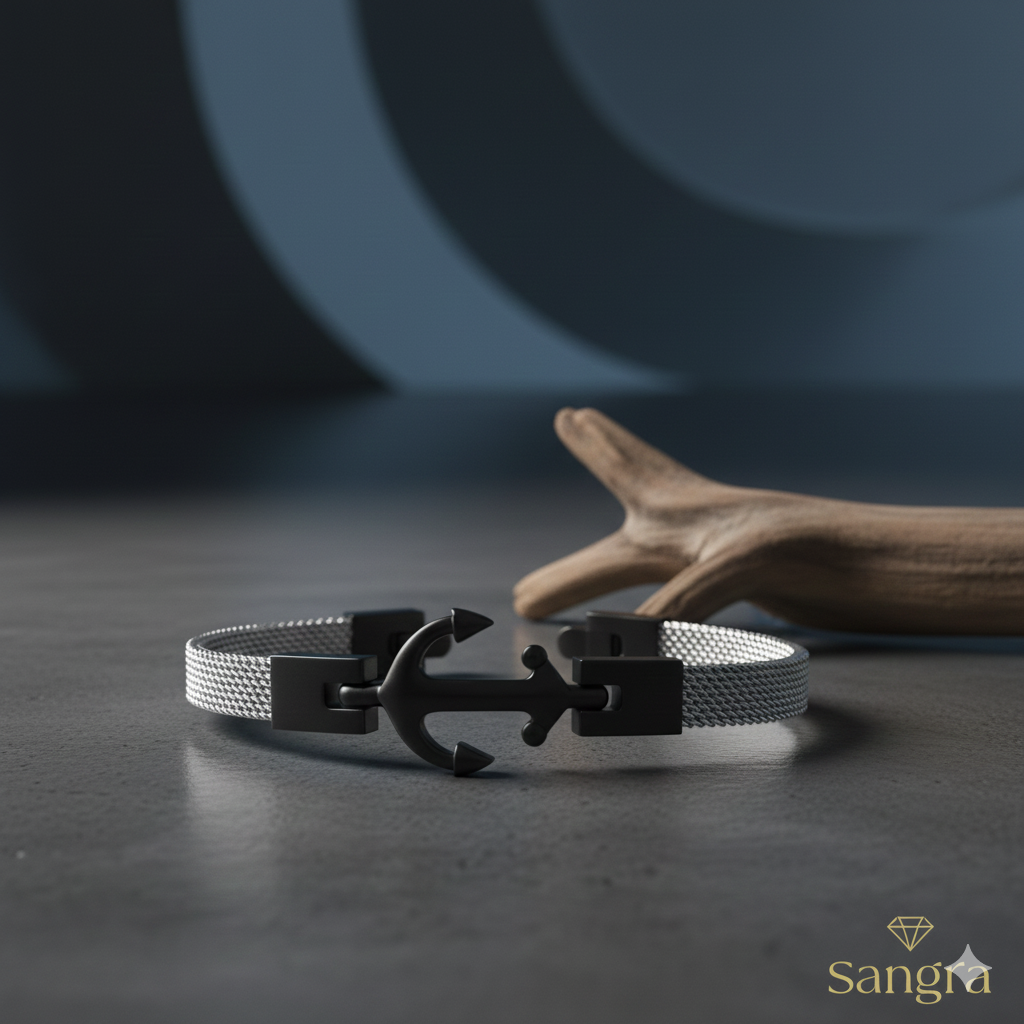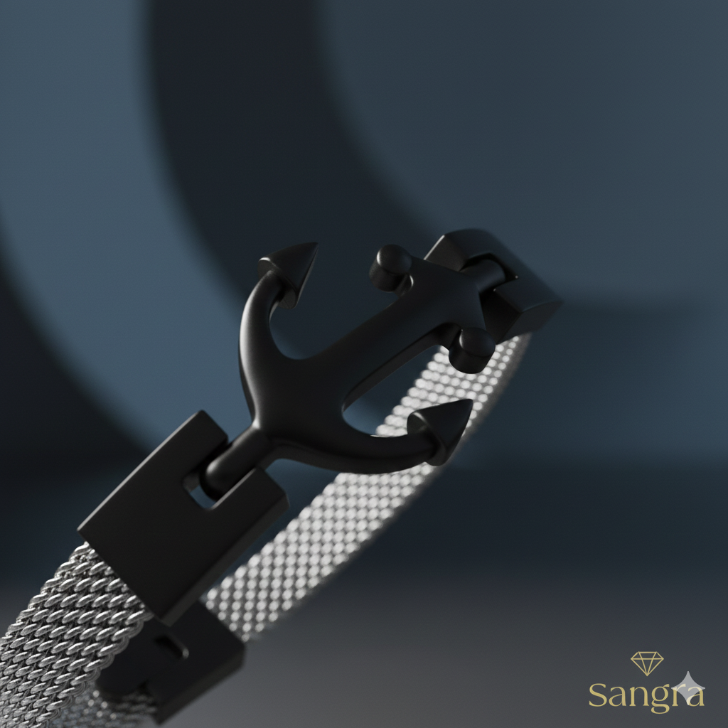 Un bracciale che celebra la passione per il mare con il suo design nautico iconico. L'ancora in acciaio inossidabile si unisce alla sofisticata maglia milanese, creando un accessorio unisex che esprime avventura e stile contemporaneo.