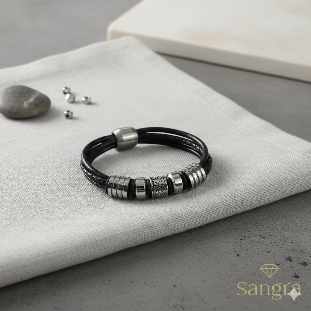 Un bracciale che unisce la robustezza dell'acciaio inossidabile alla morbidezza della pelle nera di alta qualità. Con una lunghezza di 20 cm, questo bracciale è perfetto per l'uomo moderno che cerca un accessorio elegante e distintivo.