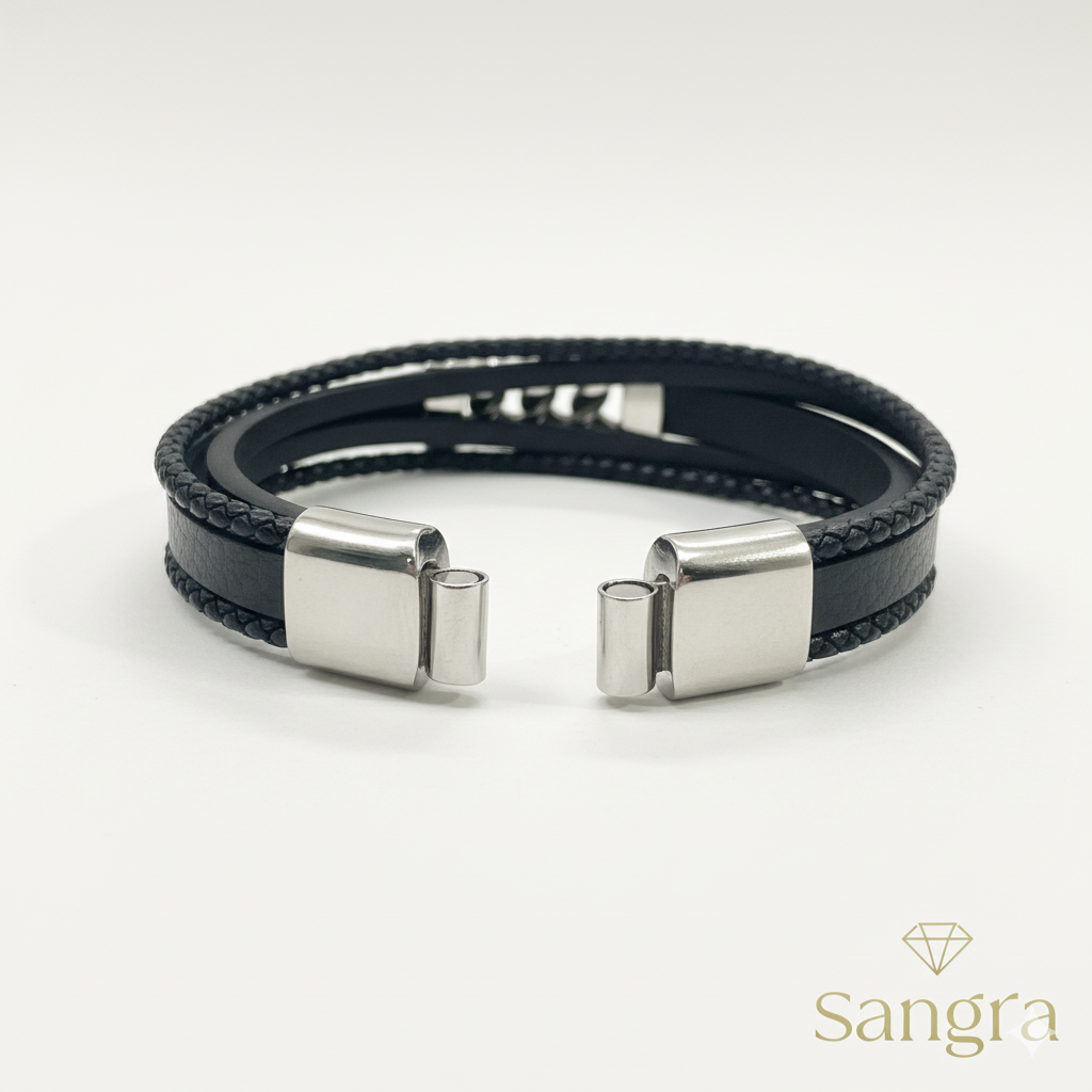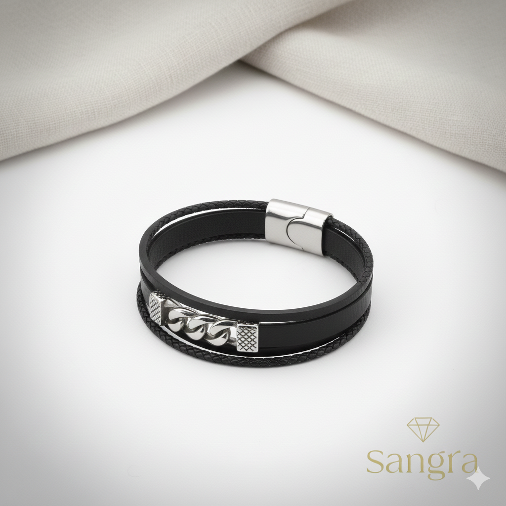 Un bracciale che unisce la robustezza della catena cubana in acciaio alla raffinatezza della pelle nera. La chiusura a incastro garantisce sicurezza e praticità, mentre il design audace esprime personalità e stile contemporaneo.